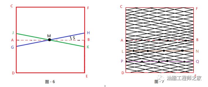 如果只在此图中选取快、慢破碎辊上各一条破碎齿条来分析,如图-6所示(蓝色GH直线代表快辊齿条,绿色JK直线代表慢辊齿条),可以看到,在其焦点M处正是两个齿条在相对运动中剪切大豆的位置。再回到图-5,可以看到,在AB虚线所代表的瞬间,有多个点在同时剪切大豆。而在AB线上没有快、慢辊齿条相交的区域,代表此瞬间没有剪切。