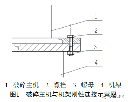 如图1所示,破碎主机与机架通过螺栓和螺母连接,破碎主机与机架之间没有缓冲和减振装置。由于螺栓弹性模量较大、变形量较小,因此本方案视为刚性连接。