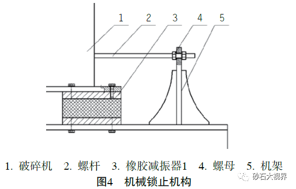 由于橡胶与钢板胶合力较小,因此这种减振器只允许承受轴向压力和较小的径向剪切力。破碎机工作时会产生较大的冲击和振动,因此破碎机一般选用皮带传动,用于缓冲和吸能。为了保证传动皮带具有足够的预紧力、防止皮带脱轨飞出,并避免减振器因径向过载损坏,必须限制减振器径向位移,所以需要在破碎机传动皮带预紧力方向上增加机械锁止机构(如图4所示),用螺杆限制破碎机在此方向上的位移量。