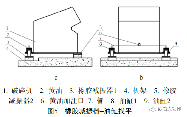 移动式破碎站机架一般是焊接构件,在焊接应力影响下产生变形,其安装面的形位公差很难保证,即便是在焊接工装辅助下也依然难以保证,增加橡胶减振器的方案无法解决结构超差产生的装配应力。为了满足实际使用要求,目前各大厂家的主流解决方案是提高技术要求,并加强安装位置的工艺控制。但由于成本较高和稳定性差,效果并不理想,然而橡胶减振器+油缸找平的解决方案可以完美解决这一难题。但由于增加了油缸和管路等部件,经济性较差。