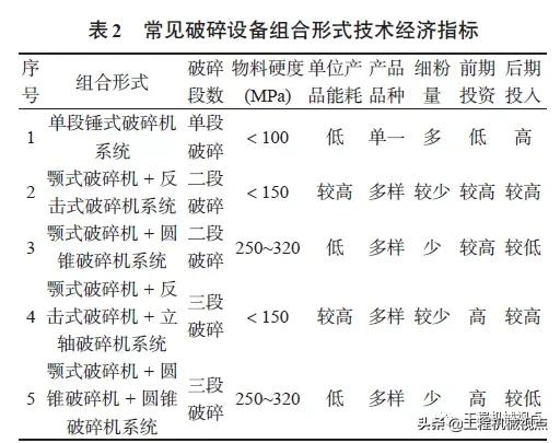 以上5种破碎设备组合形式的技术经济指标如表2所示。