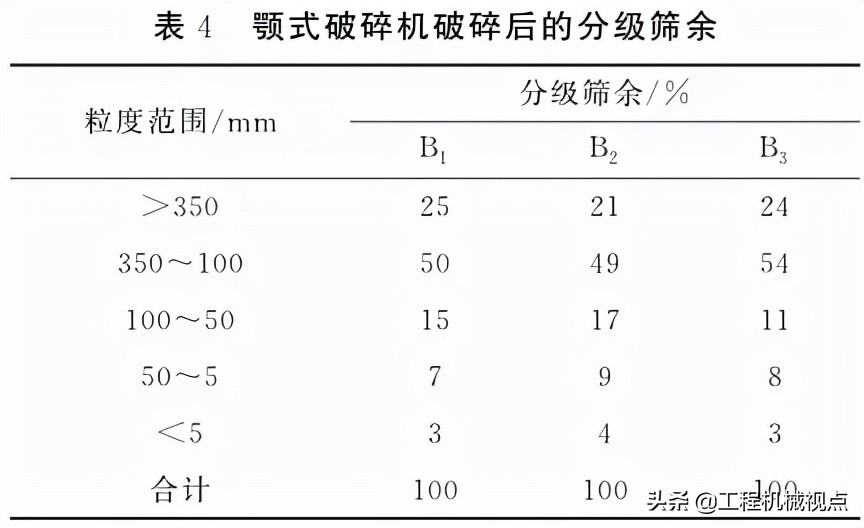 将碎石按照表2中的比例均匀混合后制得6种样品各1000t,随机选取3份通过液压旋回破,分别编号为A1、A2、A3。剩余3份进入颚破,分别编号为B1、B2、B3。对破碎后的物料进行筛分,结果见表3、表4: