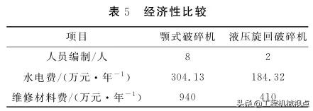 可以看出:液压旋回破在生产过程中较颚破人员编制可减少75%,材料维修费减少56.38%。采用液压旋回破作为粗碎设备可在人员工资、能耗和维修费等方面为企业节约上百万元成本。