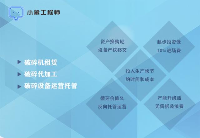而小象工程师破碎服务商,不仅提供破碎设备租赁,还可提供破碎代加工服务,积量换购,破碎机器使用空置还可委托小象工程师托管运营,实现收益最大化,投资回报率更高!