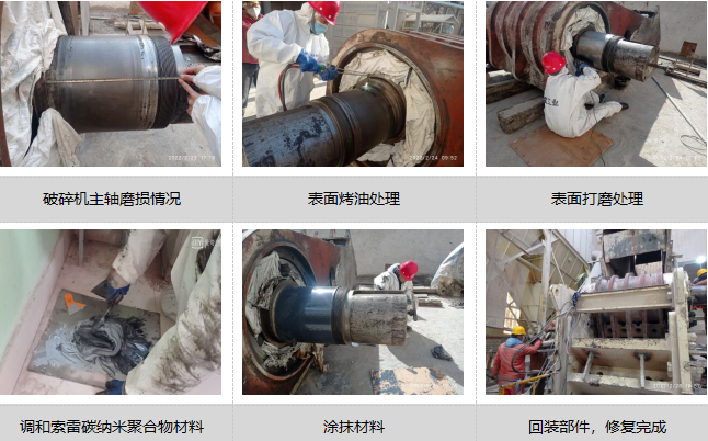 某企业颚式破碎机在运行过程中出现了主轴磨损问题,其轴承型号为231/500CAK/C3W33,轴径为Ф450mm,磨损宽度为310mm,磨损深度为单边2-4mm,局部有深沟。该企业在遇到颚式破碎机主轴磨损问题时,是选择用索雷碳纳米聚合物材料进行修复的,该材料具有粘结强度高、综合力学性能好、抗腐蚀、易于成型、可加工等优势。并且可以实现现场在线修复,不需要对修复表面做二次加工处理,不仅可以降低工人劳动强度和施工中的不安全因素,而且可以缩短企业停机停产时间,降低企业损失。