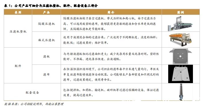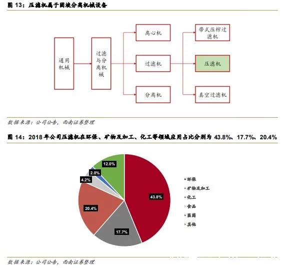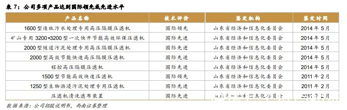 制造业单项冠军示范企业,产品竞争力强。公司于2018年被中国工业信息化部和中国工业经济联合会认定为制造业单项冠军示范企业,过滤成套设备在产品性能、技术水平等方面得到了客户的广泛认可,多项产品已达到了国际领先或先进水平,与国内外同行相比,具有较强的竞争实力,2019年压滤机国内市占率高达38.5%。随着下游行业产业升级的持续进行以及公司持续推出新产品,预计公司市占率将进一步提升。