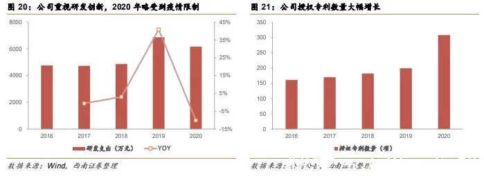 公司重视研发创新,授权专利大幅增长。公司十分重视产品研发工作,每年均投入大量资金用于产品开发与技术工艺优化,2020年研发支出为6167.9万元,同比减少10.1%,主要是研发活动受疫情影响所致。在公司持续不断进行研发投入的背景下,公司授权数量也在稳步增长,截至2020年累计获得308项,2020年新获得授权专利109项,专利数量取得大幅增长。未来公司将继续推动技术创新,不断提高产品竞争力,满足客户新需求。