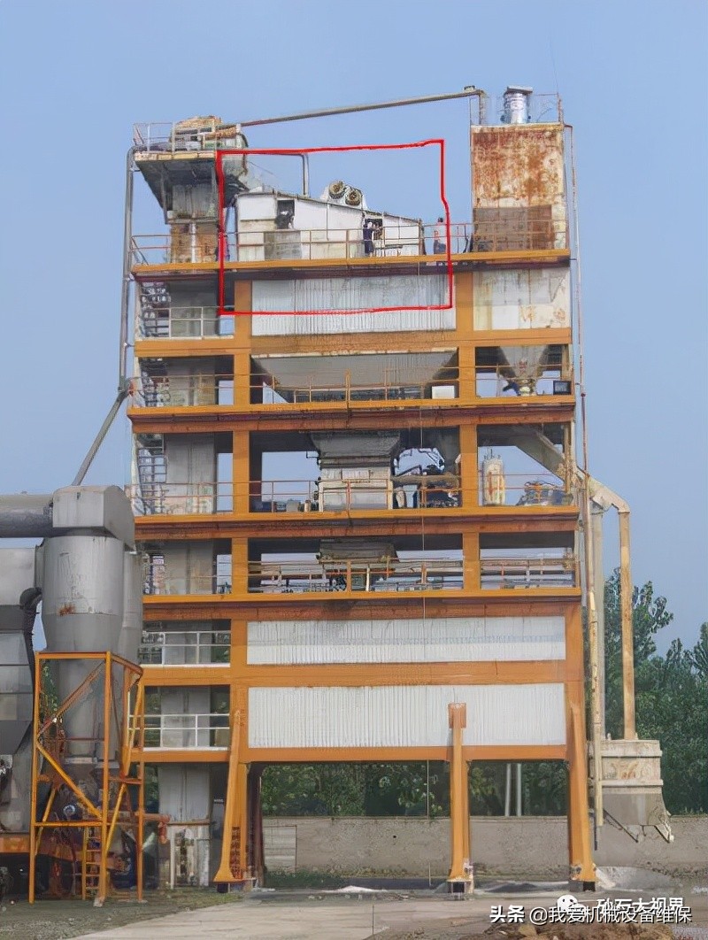 振动筛在沥青搅拌设备的顶层,见图所示,红色线框内为振动筛。