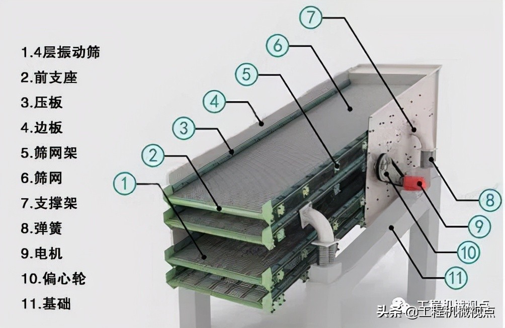 圆振动筛是由筛箱、激振器、支撑装置等部件组成。