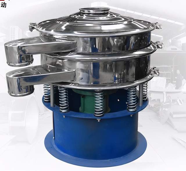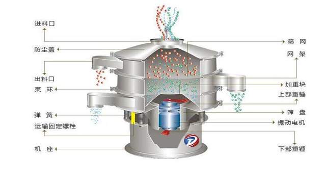 三次元振动筛分过滤机/旋振筛的动力源是振动电机,振动电机转轴上下端安装有重锤(不平衡重锤),通过振动电机的旋转运动在不平衡重锤作用下转变为水平、垂直、倾斜的三维运动即三次元运动,旋振筛利用振动电机三维运动,通过旋振筛的弹簧和振动体把三维运动传递给振动筛网面。通过改变振动电机上下重锤的相位角来实现物料在筛面上的运动轨迹,以此达到筛分、去杂、过滤的目的。