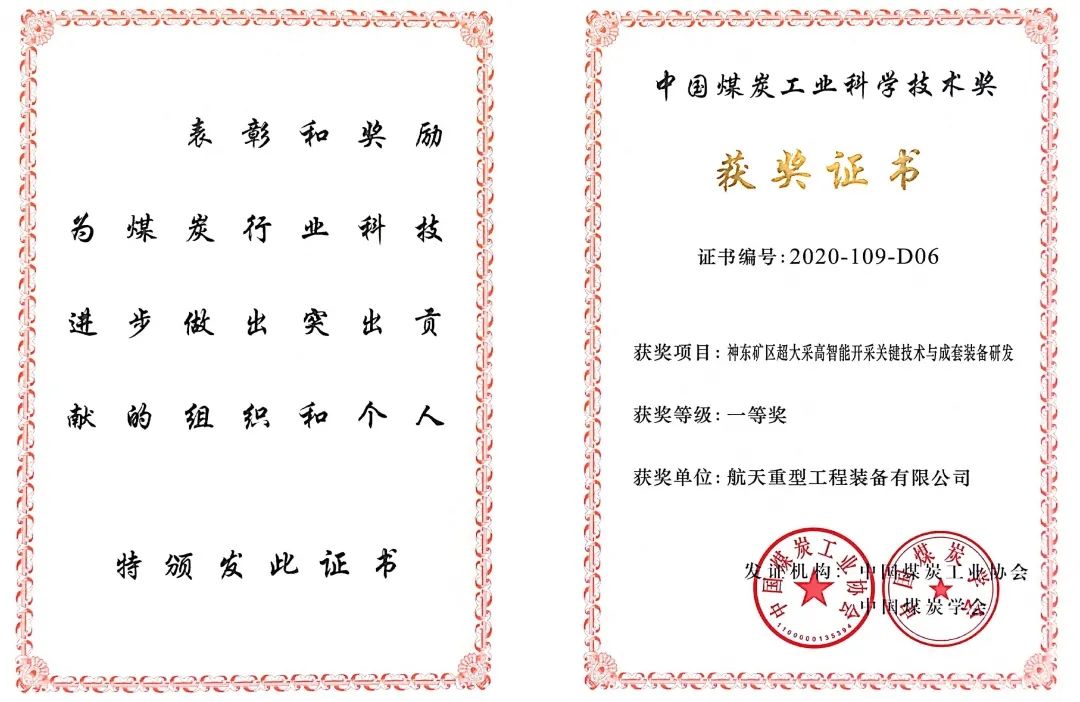 2021年2月21日从航天重工获悉,公司自主研发的超大采高煤矿井下综采双百吨矿用装备荣获中国煤炭工业科学技术一等奖。
