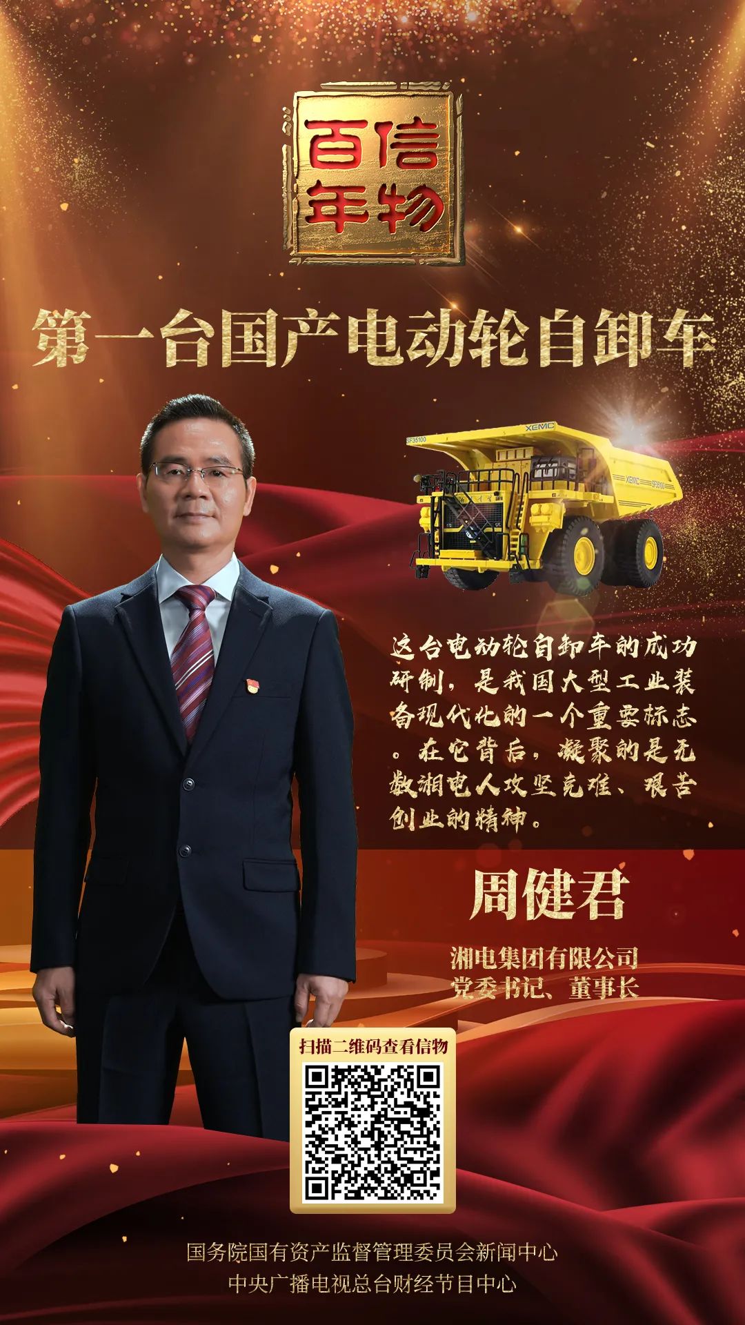 信物讲述人,湘电集团有限公司党委书记、董事长周健君动情地说,这台电动轮自卸车的成功研制,是我国大型工业装备现代化的一个重要标志。在它背后,凝聚的是无数湘电人攻坚克难、艰苦创业的精神。从1977年研发成功的108吨自卸车,到154吨、220吨、300吨大车相继问世,完全攻克了轮毂电机技术和直流、交流牵引控制技术,标志我国电动轮自卸车在载重上达到了世界水平。2021年7月,湘电研制的世界首台百吨级纯电矿用自卸车正式投入运行,这又是一次全新的技术革命,矿用装备进入了新能源时代。