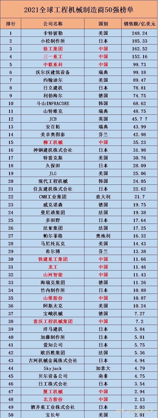 美国2家,分别是卡特彼勒及约翰迪尔,其中卡特彼勒也是全球最大的工程机械制造商,去年销售额达到248.24亿美元。