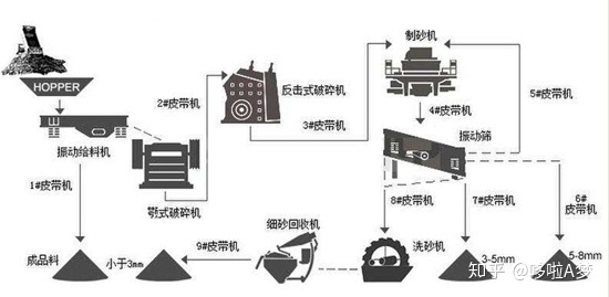 机制砂石生产工艺主要有两段破碎和三段破碎两大类,小型机制砂石生产线多采用两段破碎筛分流程,某些大型机制砂石生产线因物料块度较大,多采用三段破碎筛分流程,采用四段破碎筛分流程的比较少。