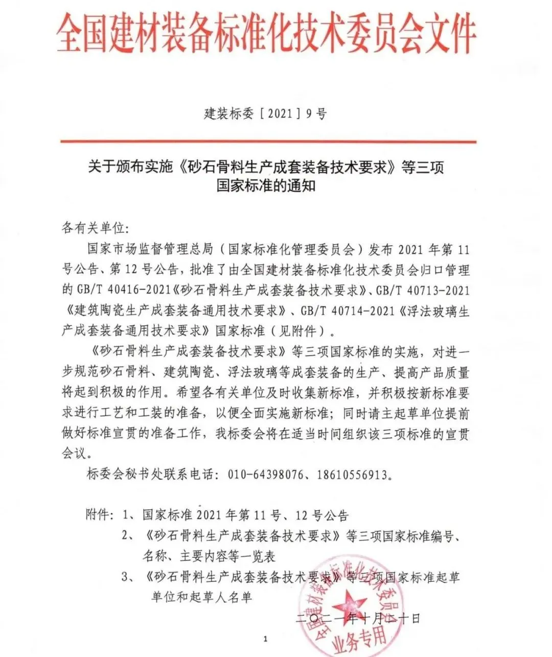 日前,国家市场监督管理总局(国家标准化管理委员会)批准发布了450项推荐性国家标准和4项国家标准修改单(2021年第11号),其中包括枣庄鑫金山智能装备有限公司参与起草的国家标准——GB/T40416-2021《砂石骨料生产成套装备技术要求》,该标准将于2022年3月1日起正式实施。