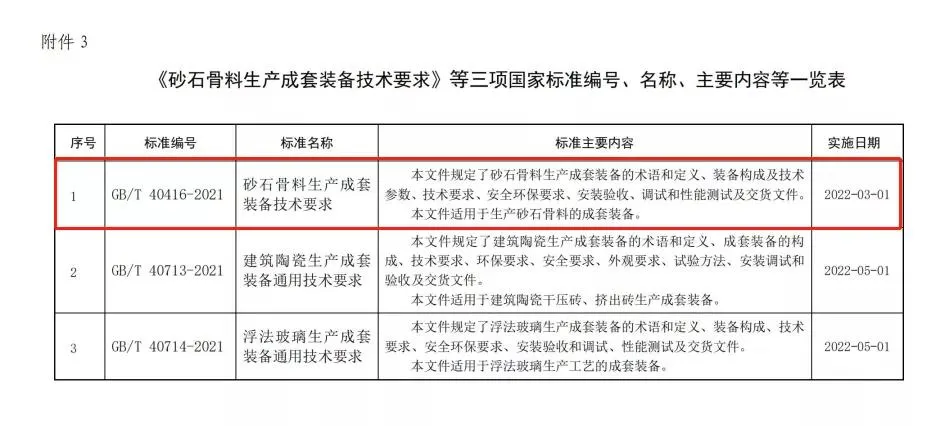《砂石骨料生产成套装备技术要求》国家标准的实施,将进一步规范行业市场,提高产品质量,对促进我国建材装备领域发展将起到积极作用。