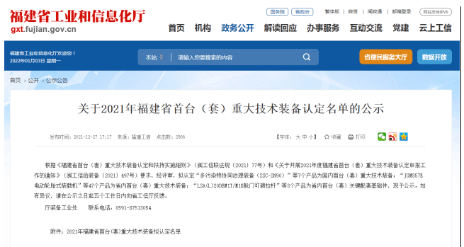 同年12月由省、市工信部门领导、行业机械技术专家和财务专家组成的评审小组对已通过初审的企业进行现场调研、技术答辩、材料复查,并最终认定福建绿能科技等14家泉州市企业入选2021年福建省首台( 套 )重大技术装备名单。