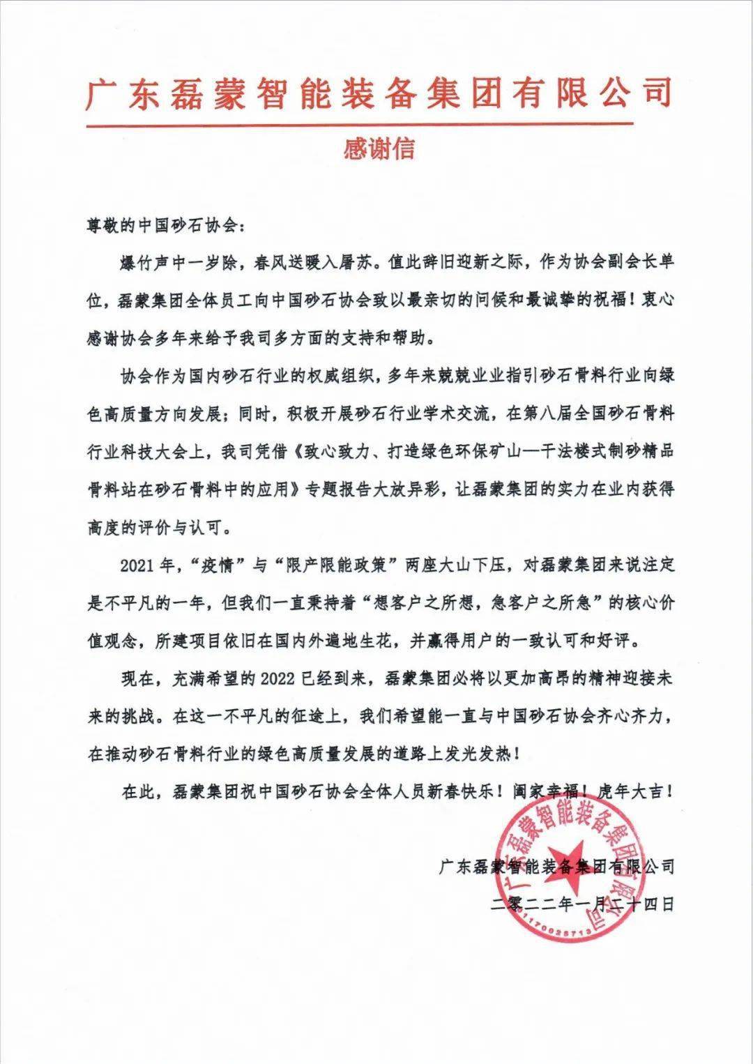 原标题:感谢信 | 广东磊蒙智能装备团有限公司向中国砂石协会发来感谢信