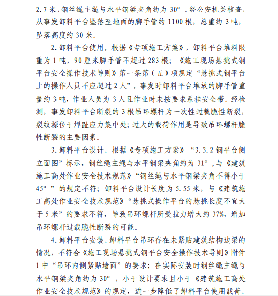 卸料平台严重超载是导致吊环螺杆过载脆性断裂的主要因素;卸料平台钢丝绳主绳与水平钢梁夹角过小,吊环未紧贴建筑结构边梁、悬挑长度略大等设计、安装不符合有关规定的情况导致卸料平台实际承载能力降低,是吊环螺杆断裂的次要因素;吊环材质、焊缝长度不满足设计要求,吊环存在焊趾凹坑、制作吊环时材质性能受损,吊环材料在低温下脆性增加等因素均进一步增加吊环螺杆脆性断裂的可能,在严重超载情况下吊环螺杆发生过载脆性断裂、引发卸料平台侧翻,作业人员未系挂安全带,从高处坠落,导致事故发生。