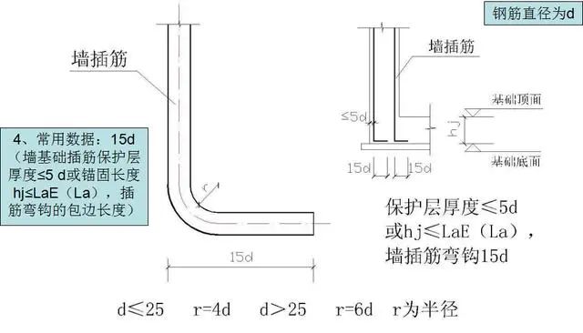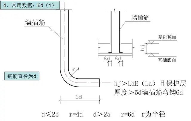 6)墙基础插筋保护层厚度≤5 d或锚固长度hj≤LaE(La),插筋弯钩的包边长度。