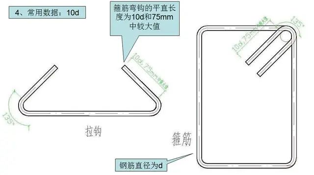 1)10d;≥75mm:抗震要求下所有的箍筋、拉钩弯钩的平直长度。