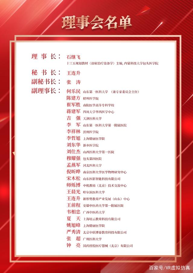 参会代表来自山东第一医科大学、内蒙古科技大学包头医学院、哈尔滨医科大学、上海健康医学院、天津医科大学、河北医科大学、广州医科大学、广西中医院大学、四川大学华西医学中心、南京医科大学物理研究中心、蚌埠医学院、南阳医学高等专科学校、滨州医学院、新乡医学院、千佛山医院、 山西医科大学第一医院、包头第四医院、安徽中医药大学第一附属医院、山东医影智能科技有限公司、上海培云科技有限公司、国药控股医疗器械(北京)有限公司等医学高校、医疗机构、企事业单位近百名同志通过线上线下相结合的方式按照选举程序选举产生第一届分会理事会成员名单如下: