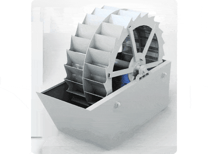 轮斗洗砂机作业原理:电机通过三角带、减速机带动洗砂叶轮做圆周转动,砂石泥浆经给料槽进入洗砂槽内,在叶轮的带动下不断翻转,互相摩擦,逐渐将砂子表面的杂质清洗干净,同时破坏其表面的水气层,更加利于脱水,同时加大水流,将杂质和比重小的异物排出水槽,从而完成砂子的清洗作业。