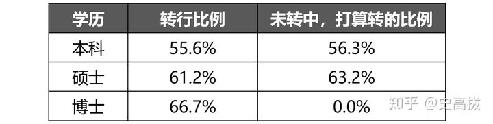 之前我以为转行比例会和学历相关,因为读研、读博一般会接触到更前瞻的内容,也有了一次新的选择方向的机会,硕士的转行比例应该大于本科,但结果呈现转行与否和转行意愿和学历的关系并不大。博士中未转行的3人均没有转行的意愿(样本量较小)。