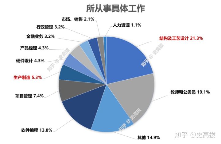 针对具体从事的工作类型,和传统机械密切相关的结构及工艺设计高居第一达到21.3%,这一工作基本是有实体产品的行业都会需要的职位。排名第二的是教师和公务员,这与题目2中高居第一的体制内19.1%基本吻合。软件编程的比例也较高达到13.8%,但因为自动化、汽车、工业控制领域都会有编程的工作,这一职业也不全是互联网的高薪工作。