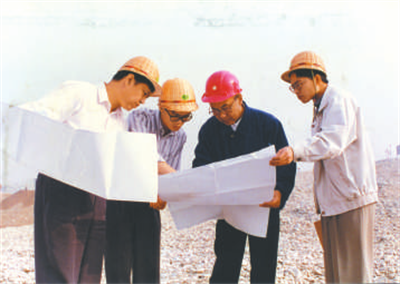 20世纪90年代,三峡工程设计总工程师郑守仁(右二)在三峡工地和同事一起讨论优化设计方案。