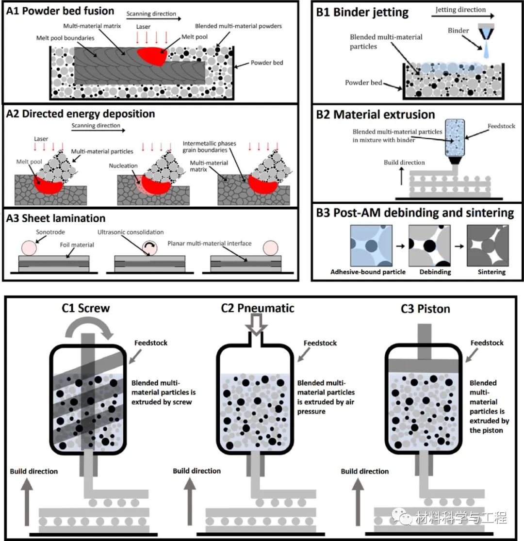 图1 (A)激光增材制造(B) 粘结剂喷射增材制造(C)三种多材料挤压增材制造技术