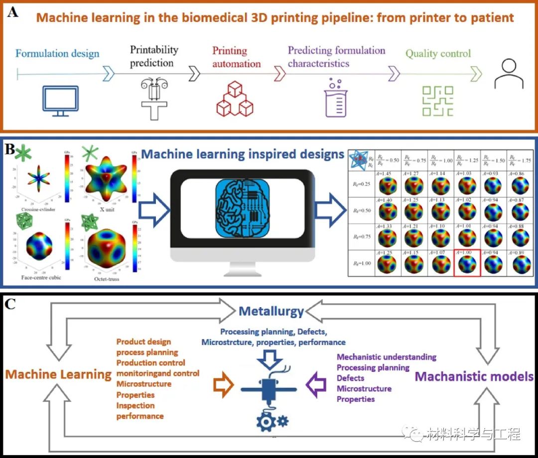 图4机器学习在3D打印技术中的应用。(A)生物医学3D打印流程的机器学习:从打印到患者(B)机器学习启发的各向同性晶格结构设计(C)冶金学、机械建模和机器学习在金属3D打印各个具体过程中的贡献。