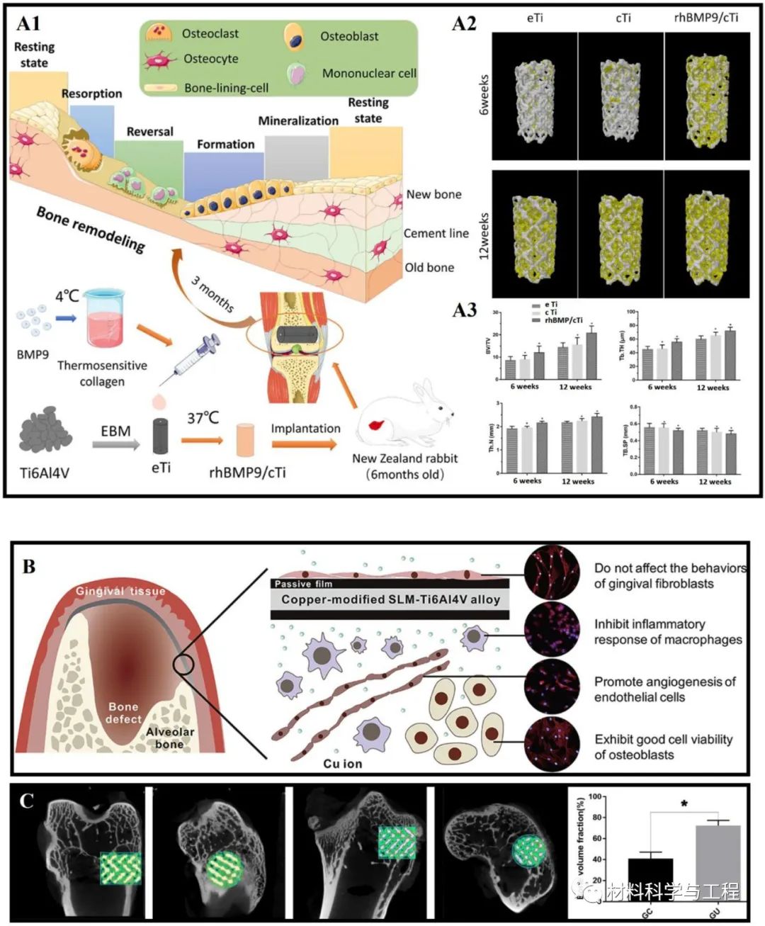 图3电子束熔融(EBM)制备多孔钛与热敏胶原复合支架的体内骨诱导实验。(B)GBR中导致细胞对Ti6Al4V-6Cu合金响应的模型;(C)植入体内8周后,多孔钛合金micro-CT图像及支架孔内骨分数定量结果