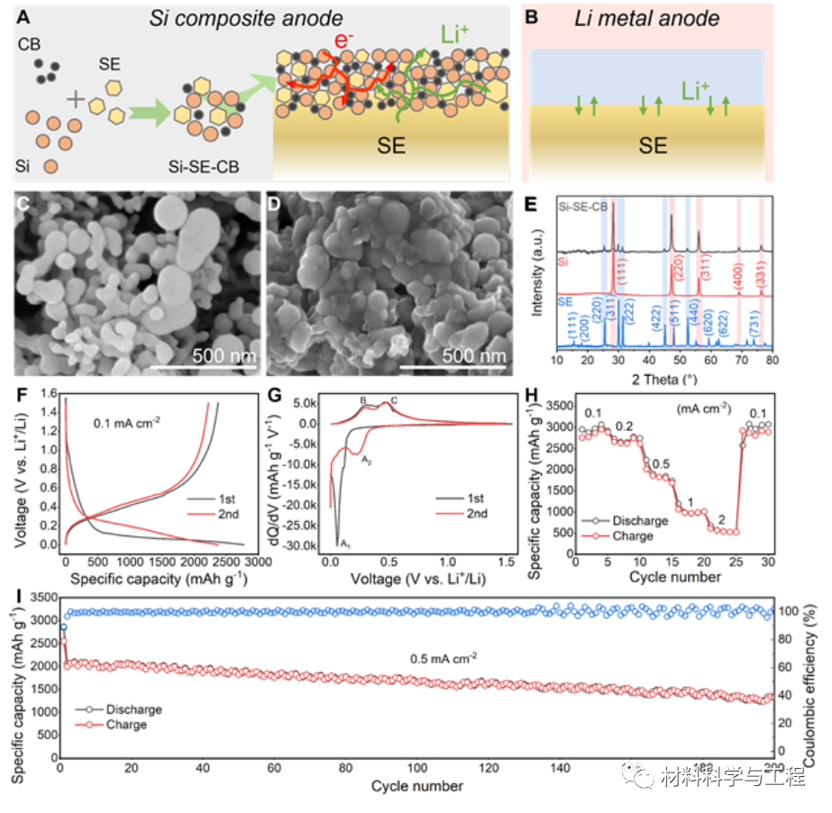 图3.硅负极的半电池性能。(A)SiE-CB的制备工艺示意图和ASLB中硅复合负极的配置方案。重点介绍了电子和离子传导路径。(B)重点介绍了锂离子电池正极的结构和离子传导途径。(C)Si纳米颗粒和(D)Si-Se-CB的扫描电子显微镜图像。(E)Si、Se、Cb和Si-Se-Cb的X射线衍射谱。(F)恒流充放电曲线和(G)第一个循环的相应dq/dv曲线。(H)在电流密度为0.1、0.2、0.5、1和2 mA cm-2时的ASLB的速率性能。(I)在0.5 mA/ cm-2电流密度下ASLB的长期循环性能。