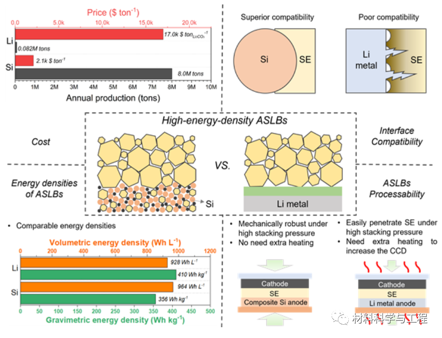 负极材料在很大程度上决定了全固态锂电池(ASLB)的能量密度。硅(Si)和锂(Li)金属是最有吸引力的两种负极材料,因为它们具有超高的理论容量。然而,目前大多数研究都集中在锂金属上,而低估了硅的巨大潜力。