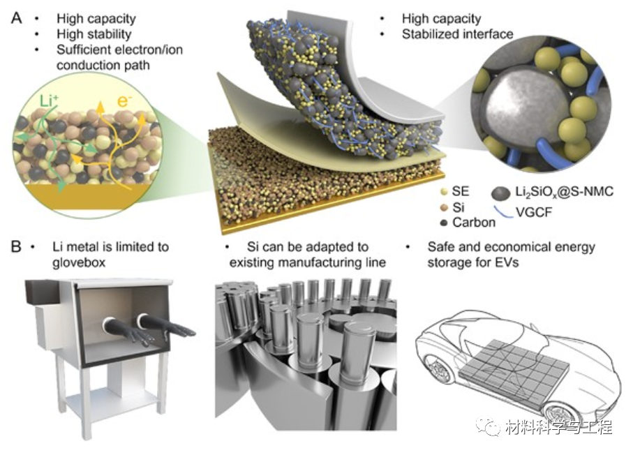 图1.高能ASLB。(A)基于硅复合负极和Li2SiOx@S-NMC复合正极的高能ASLBS的示意图;(B)硅负极的优点及其在工业制造和应用中扩大的潜力。