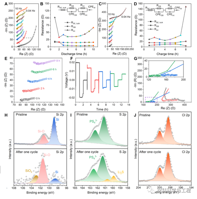 图5.循环过程中硅和锂金属负极的稳定性研究。(A)堆积的奈奎斯特曲线和(B)首次放电过程中不同放电状态下的硅负极半电池的电化学阻抗谱结果。(C)叠加奈奎斯特图和(D)不同充电状态下硅负极半电池在后续充电过程中的EIS结果。(B)和(D)中的插图是用于EIS拟合的等效电路。(E)循环前不同休止时间Li|Se|Li对称电池的堆叠奈奎斯特图。