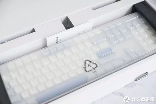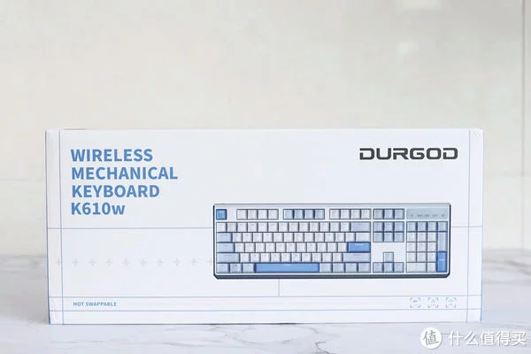 这款杜伽K610w机械键盘采用了与键盘同色的外包装,白底蓝字的搭配起来简洁、清新。