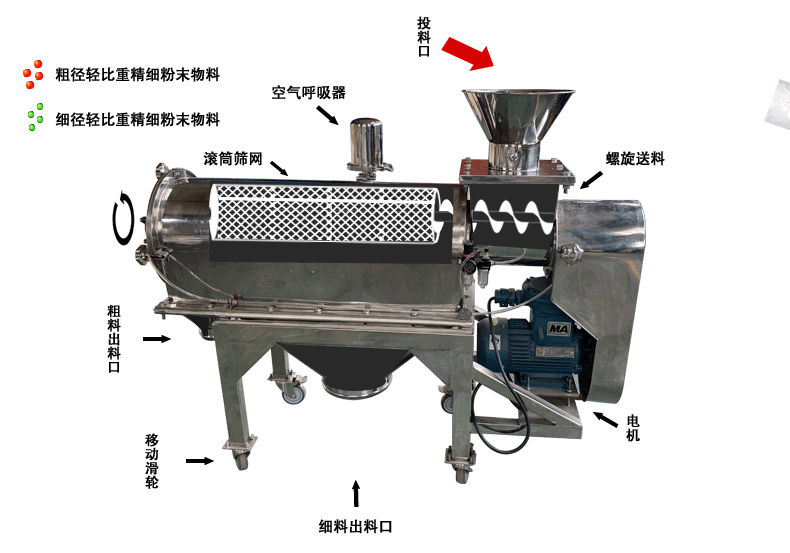 气流筛分机可以连续筛分80-530目范围内的粉状物料,当筛机启动时,物料由绞龙送入固定水平筛筒内,合适粒度的颗粒通过筛孔,过大的物料盘旋通过筒体从出料口排出。