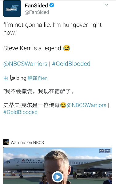 科尔下了飞机之后接受简短的采访,这位勇士主帅也非常开心,他表示:我不想撒谎,我现在处于宿醉状态。