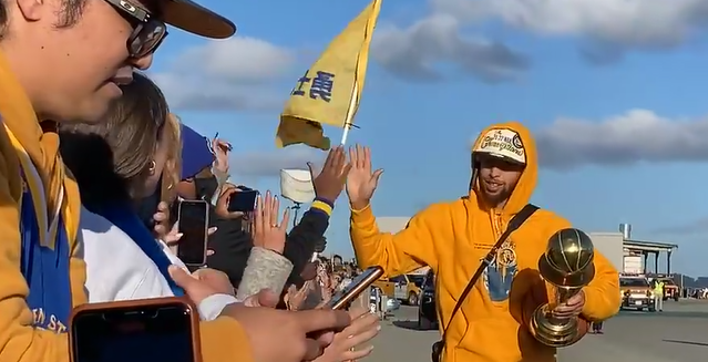 6月18日,载有新科NBA总冠军勇士的飞机已经抵达旧金山,追梦格林第一个走出飞机,他高举奖杯庆祝,之后是拿着FMVP的库里等人。现场有不少的球迷,他们欢呼庆祝,同时高喊MVP。库里非常高兴,与球迷们一起击掌庆祝,这也是库里职业生涯第一座FMVP奖杯,前三次夺冠,这一荣誉都不属于他,这次库里以碾压的姿态强势夺下奖杯。