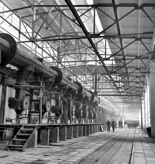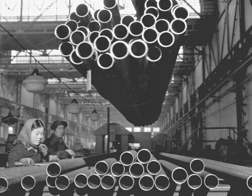 我国第一座无缝钢管厂--鞍钢无缝钢管厂大批新制好的无缝钢管正被吊运输送出厂(1953年资料照片)。新华社发