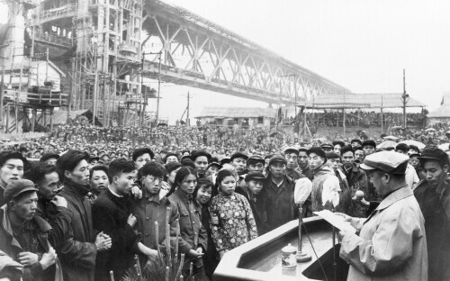 1957年5月4日,武汉长江大桥钢梁合龙庆祝大会在大桥桥头举行(新华社发)