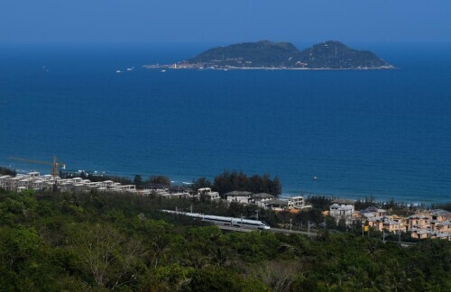 海南环岛高铁是世界首条滨海环岛高铁,列车在东段陵水站附近驶过。(新华社记者 杨冠宇 摄)