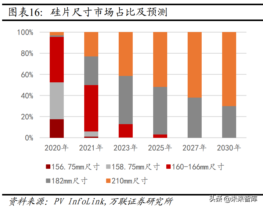 大尺寸+薄片化是硅片环节主要发展方向,带动设备更新需求。大尺寸硅片可以摊 薄产业链各环节加工成本,进而实现降低度电成本。2021年以来大尺寸硅片加速渗 透,据PV InfoLink数据,210、182大尺寸硅片2021年市占率已达50%,预计22年市 占率将达79%。薄片化能够有效减少单片硅耗量和硅片成本,目前切片工艺可以满足 进一步切薄的要求,但还需要考虑电池片、组件端制造要求。2021年p型单晶硅片平 均厚度170μm,TOPCon电池n型硅片平均厚度165μm,异质结电池硅片厚度150μm, IBC电池硅片厚度130μm。大尺寸、薄片化的发展推动了硅片环节存量设备替换需求, 为设备厂商带来充足订单。