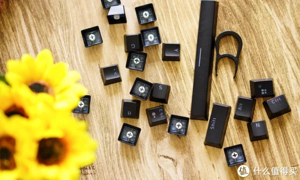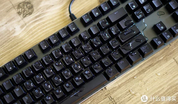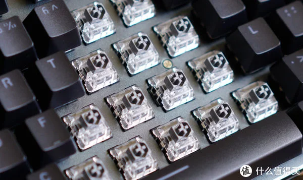 V520RGB搭配纯黑ABS材质双色注塑工艺键帽,粗体开口字符,键帽表面会有些粗磨砂质感,键帽做工水准一般,背面的水口处理不是很到位,键帽整体透光度非常好。