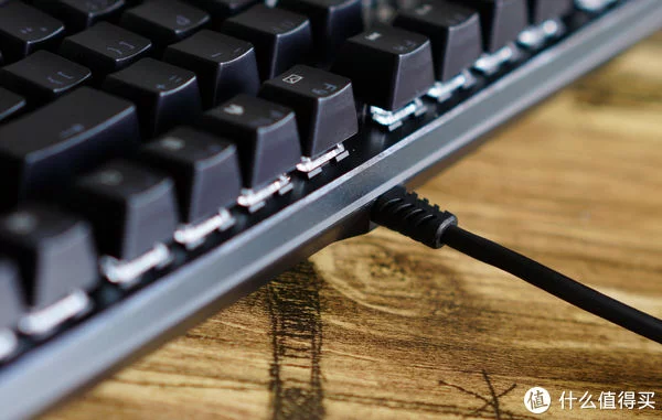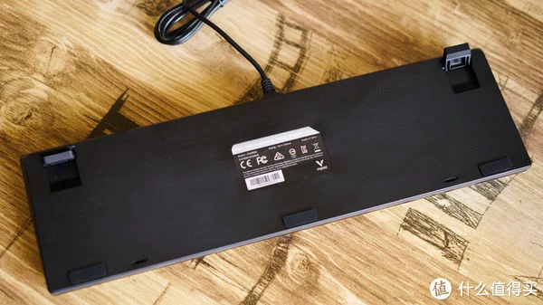 雷柏V520RGB键盘采用中出线设计,塑胶材质的线材耐弯折,连接口牢固也很耐拉扯,但这把键盘仅支持有线USB连接,键盘线长约1.8m。底部设计一段式脚撑,底部边缘的左右两侧各有一个疏水孔。