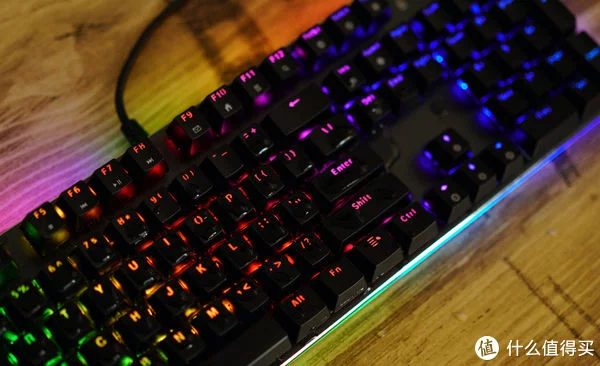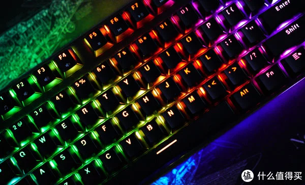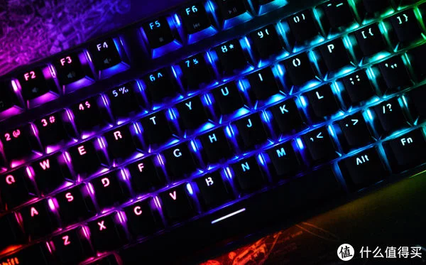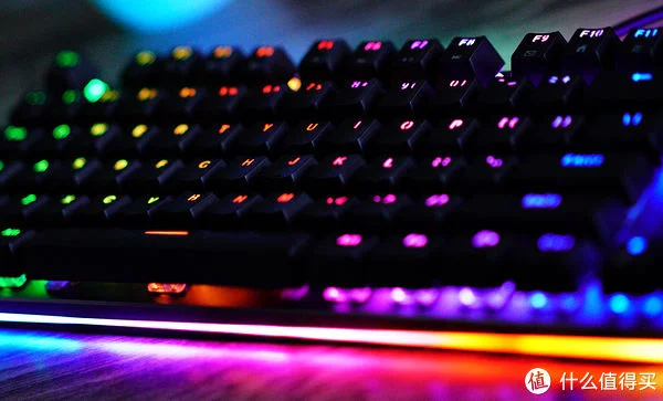 雷柏V520RGB键盘四周围着一圈乳白色RGB灯带,按键也拥有RGB背光系统米,19种灯光效果可玩度很高。跑马灯、呼吸灯等多种灯效都可以在说明书中详细查阅,通过组合键Fn+P tSC进行切换。键盘开灯后灯光很亮,RGB效果极佳。