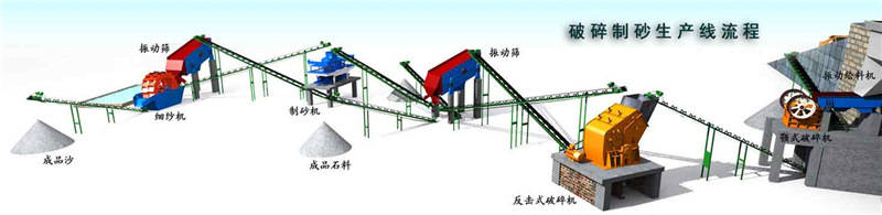 一条制砂生产线常规的有振动给料机、颚式破碎机、对辊制砂机、振动筛和胶带传输机等设备组合而成。不过为了满足客户的不同加工要求,可配备圆锥式破碎机、除尘设备等。可用于硬质石灰石、花岗岩、玄武石、河卵石、冶炼渣等多种物料的骨料及人工造砂作业,适用于水电、建材、高速公路、城市建设等行业的应用。根据不同的工艺要求,各种型号的设备进行组合,满足客户端不同工艺要求。石料由给料机均用地送进粗碎机进行初步破碎,产成的粗料由胶带输送机输送到反击式破碎机进行进一步破碎;细碎后的石料由胶带输送机送进振动筛进行筛分,筛分出几种不同规格的石子,满足粒度要求的石子由成品胶带输送机送往成品料堆;不满足粒度要求的石子由胶带输送机返料送到反击式破碎机进行再次破碎,形成闭环多次循环。成品粒度可按照用户的需求进行组合和分级,为保护环境,可配备辅助的除尘设备。