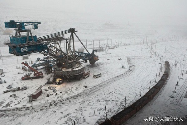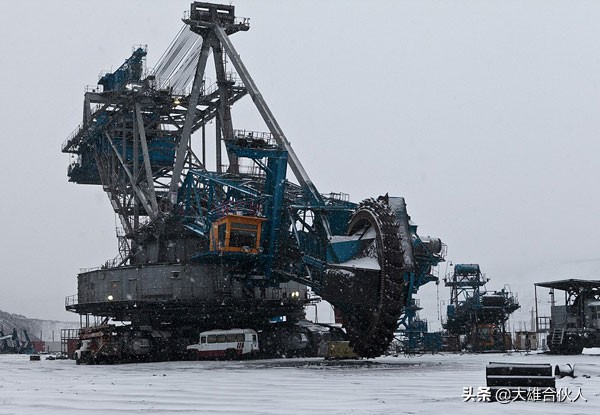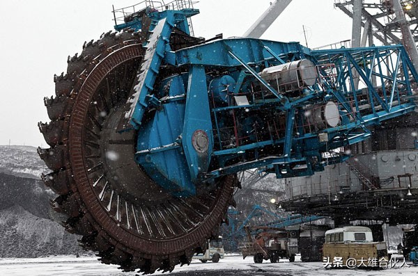 斗轮挖掘机:四层楼高、重四万五千吨、直径12米、作业能力4500吨/h。这样一台选矿设备成本约6.2亿人民币、需 要27人同时操作、一小时可以前行550米。